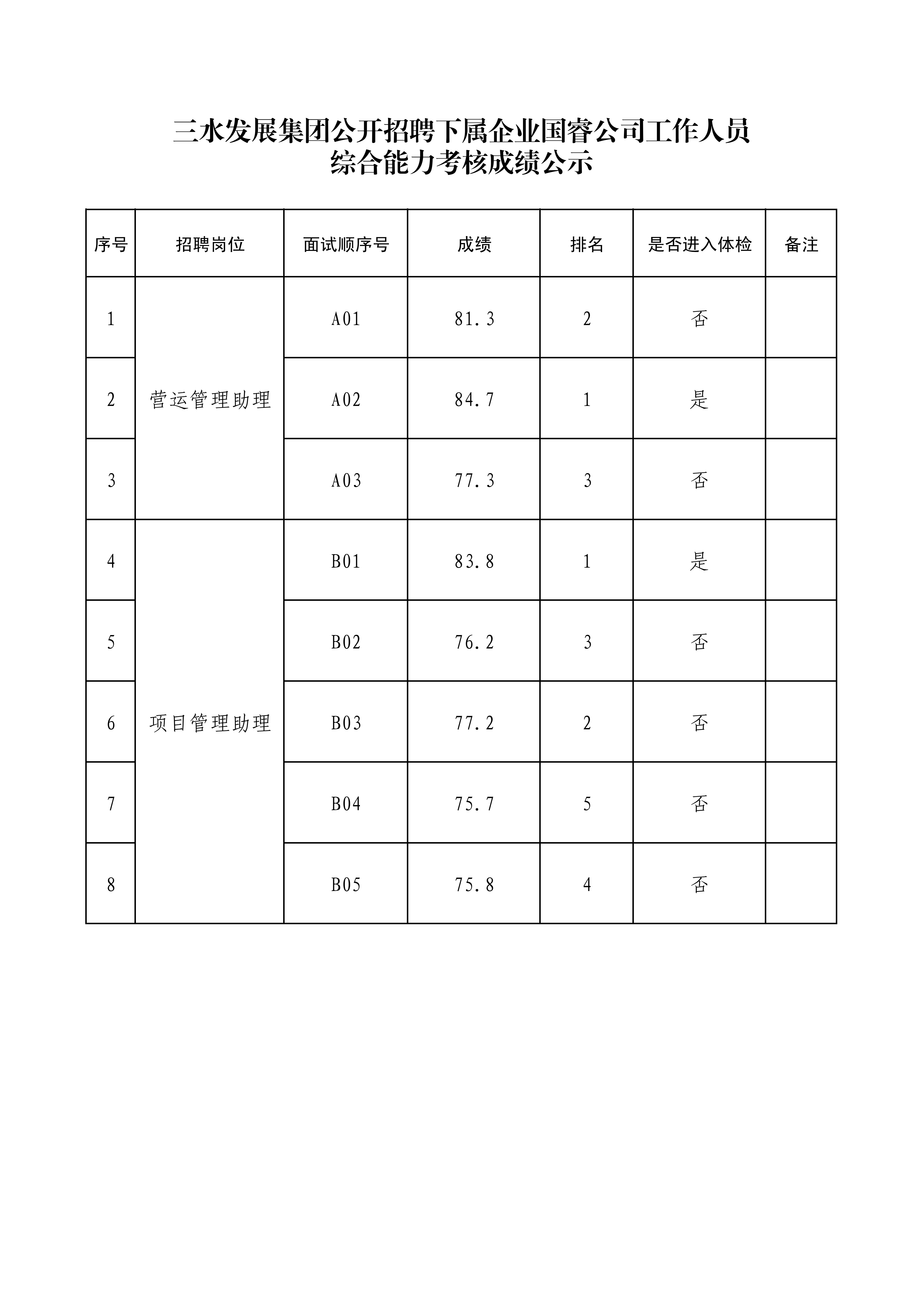 三水发展集团公开招聘下属企业国睿公司工作人员综合能力考核成绩公示