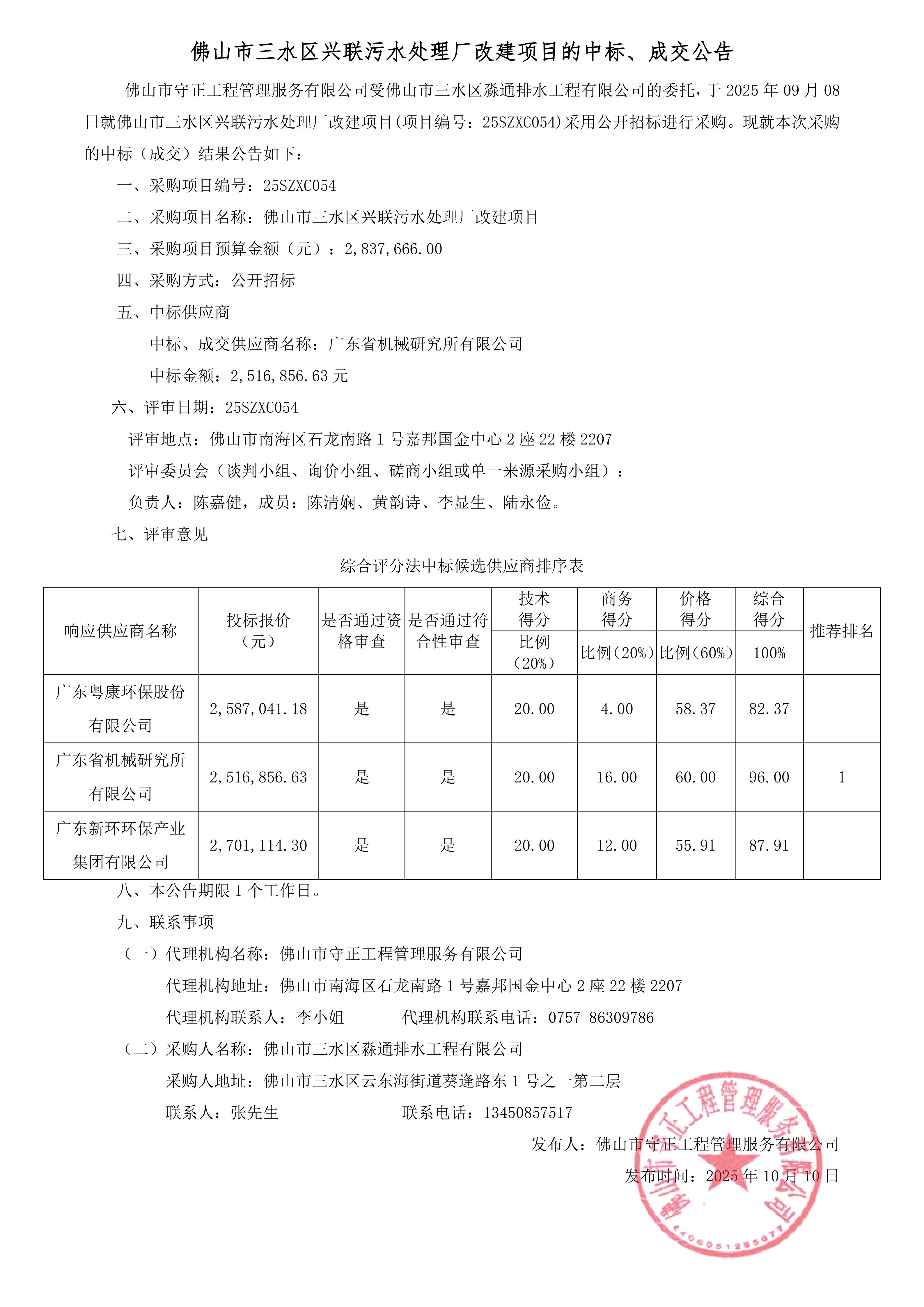 佛山市三水区兴联污水处理厂改建项目的中标、成交公告