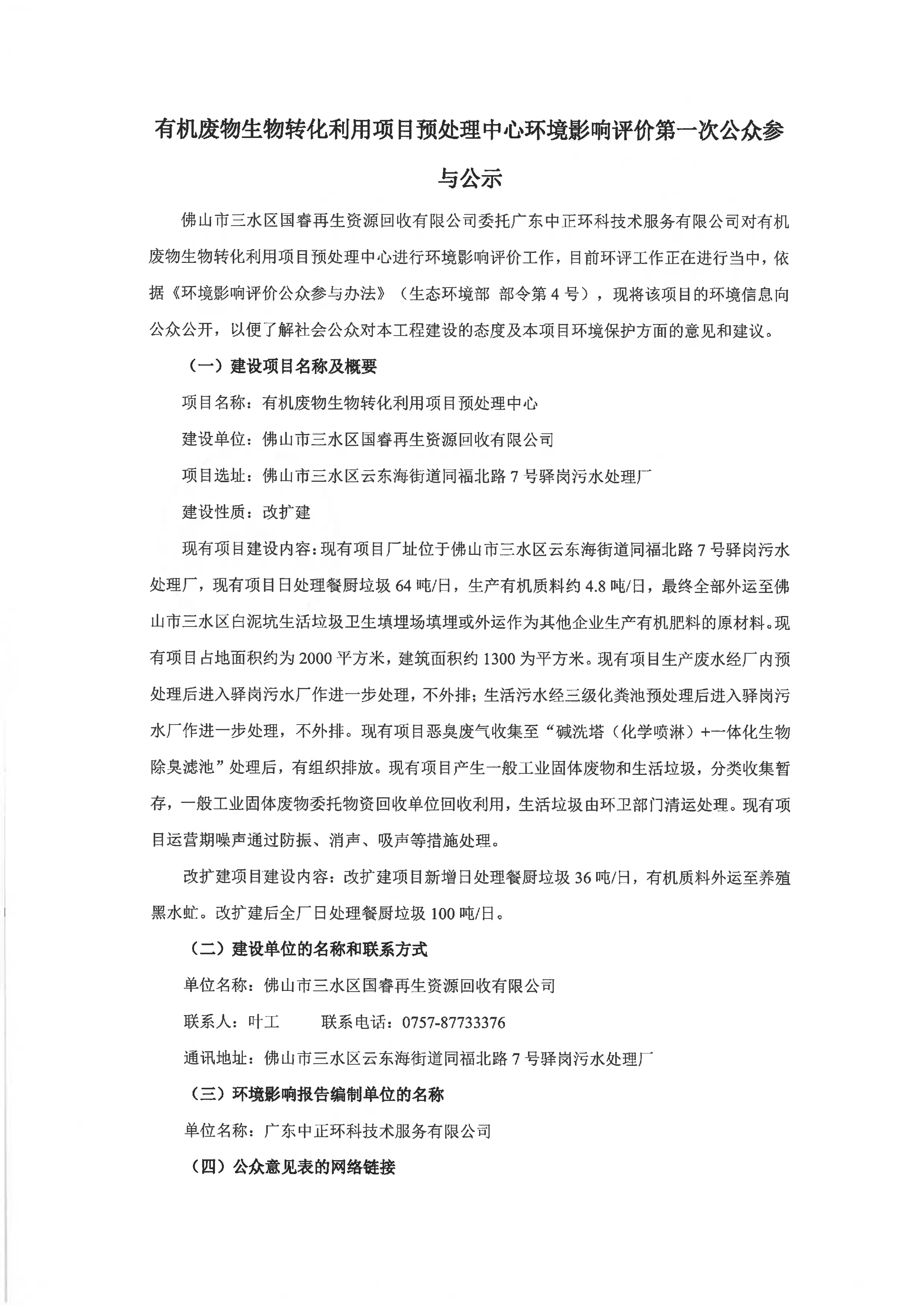 有机废物生物转化利用项目预处理中心环境影响评价第一次公众参与公示