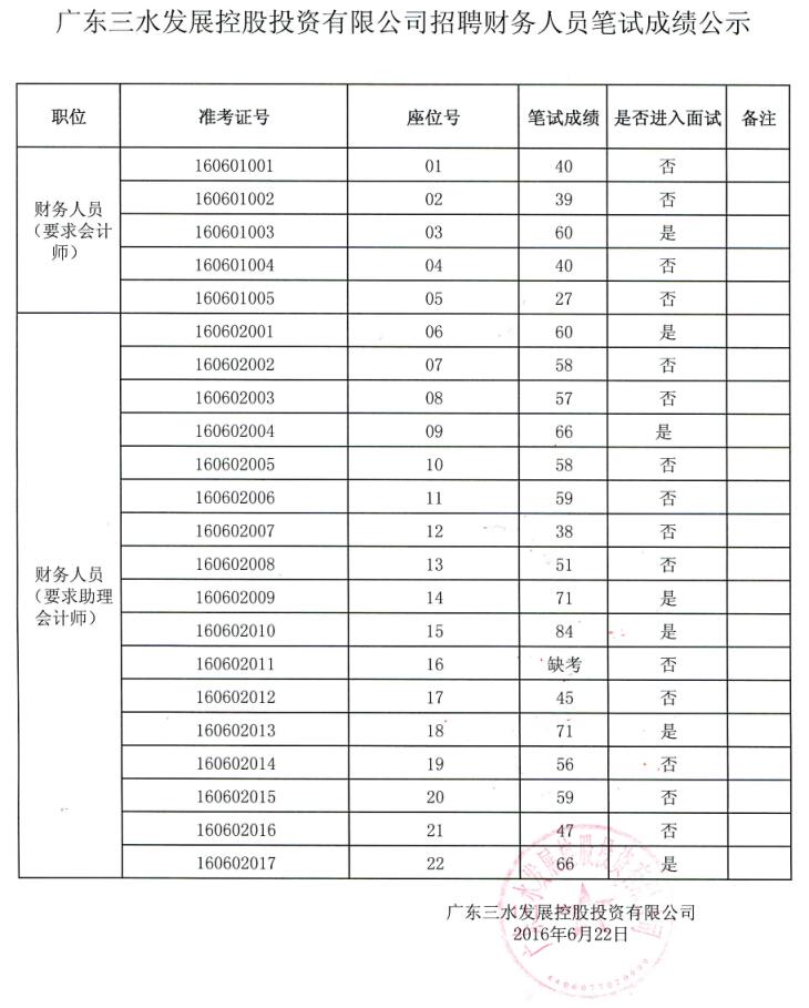 广东三水发展控股投资有限公司招聘财务人员笔试成绩公示