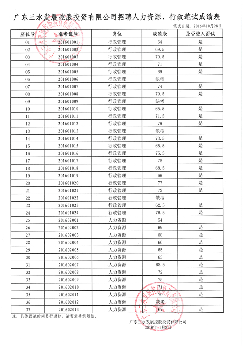 广东三水发展控股投资有限公司招聘人力资源和行政人员笔试成绩公示