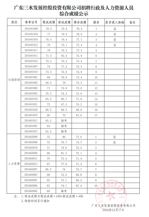 广东三水发展控股投资有限公司招聘行政及人力资源人员综合成绩公示