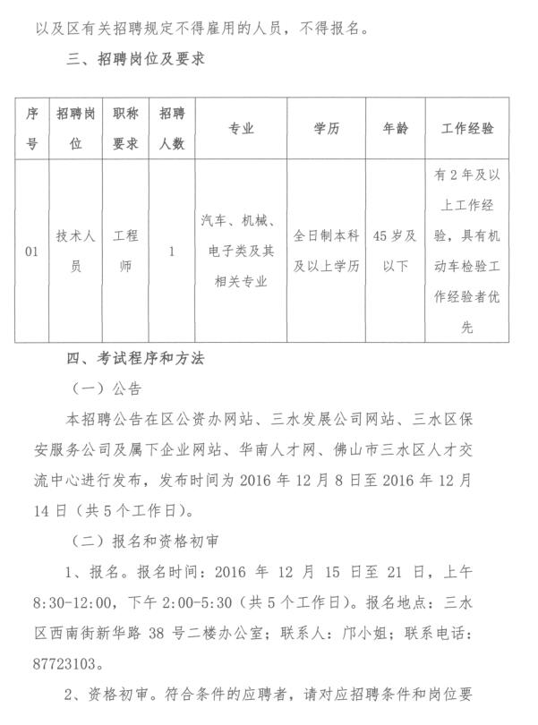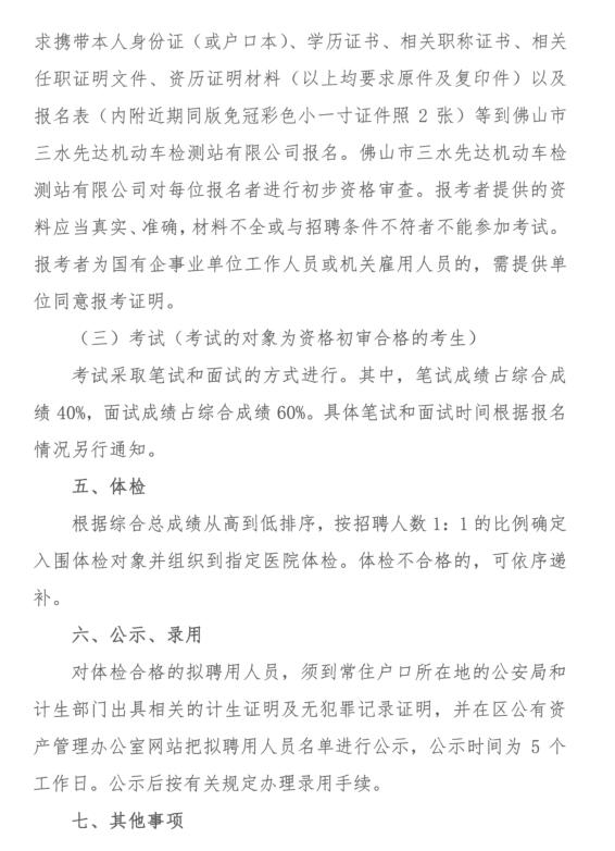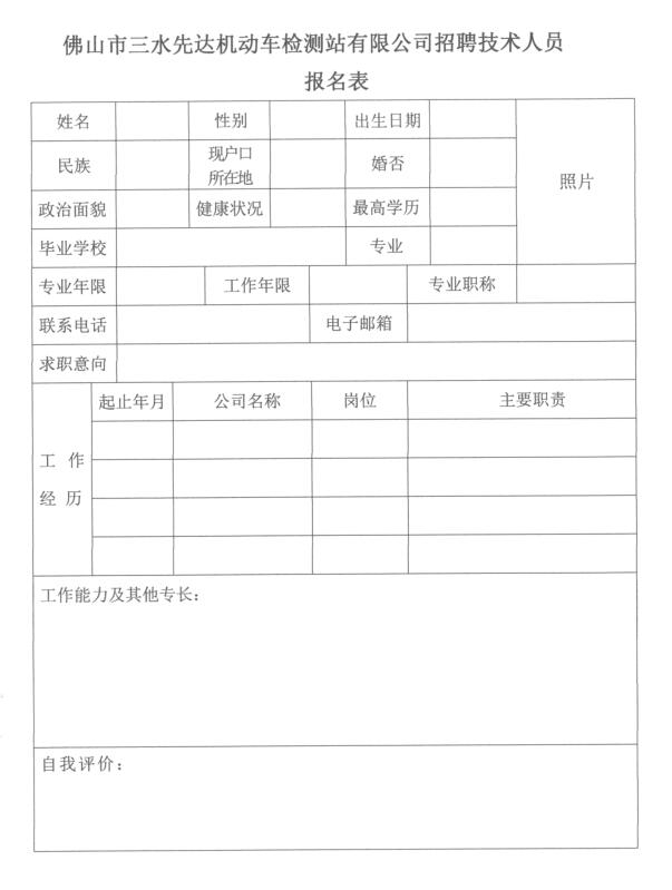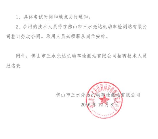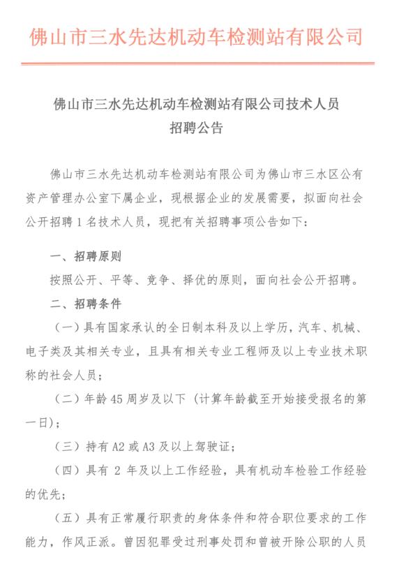佛山市三水先达机动车检测站有限公司技术人员招聘公告