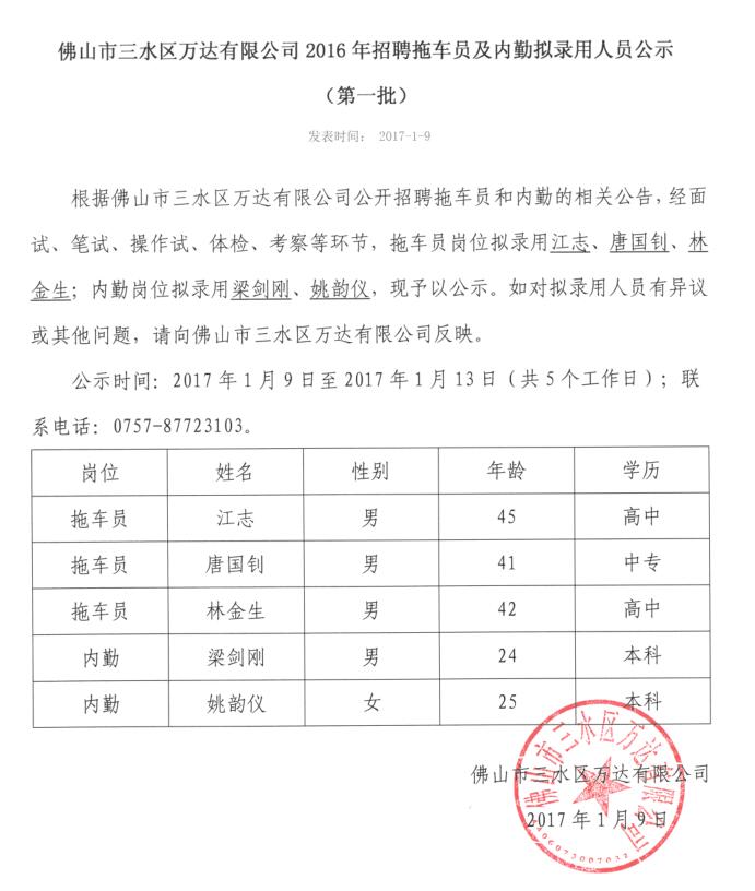 佛山市三水区万达有限公司2016年招聘拖车员和内勤拟录用人员公示(第一批)