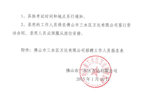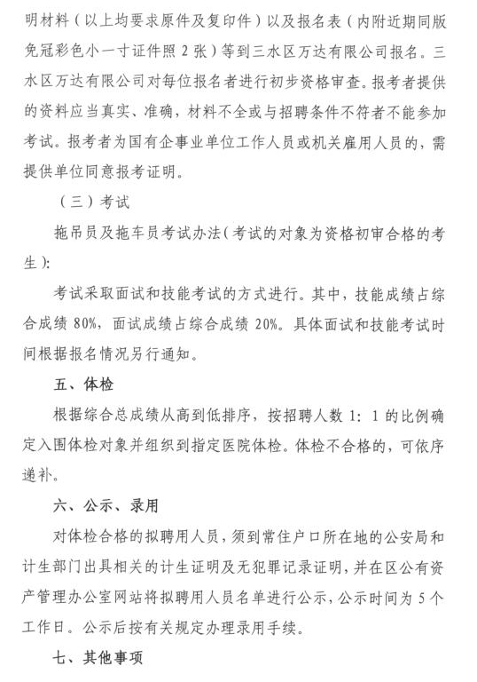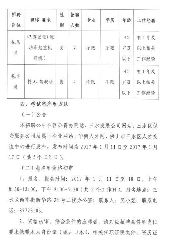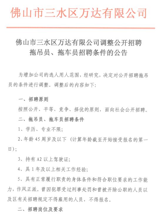佛山市三水区万达有限公司调整公开招聘拖吊员、拖车员招聘条件的公告