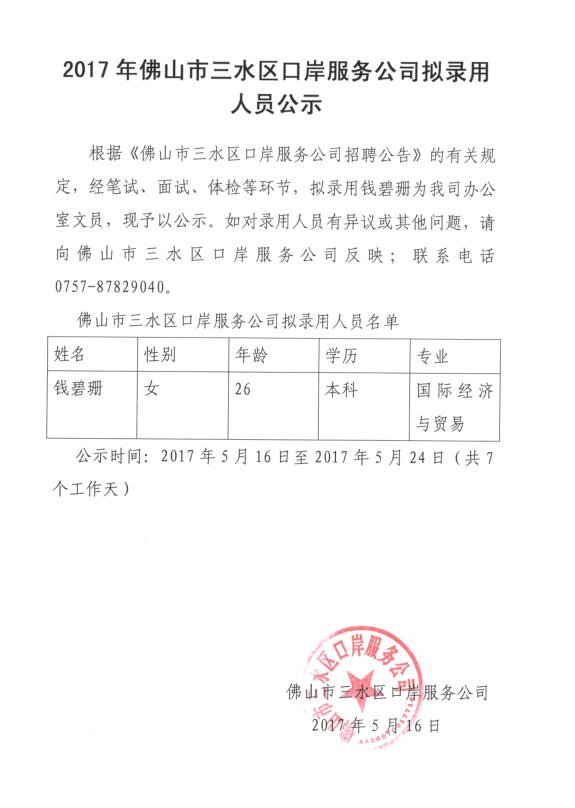 2017年佛山市三水区口岸服务公司拟录用人员公示