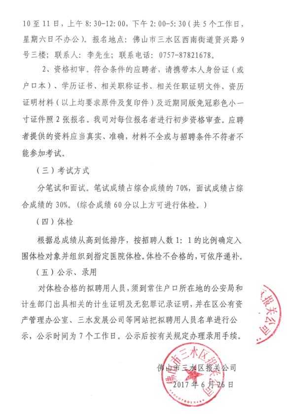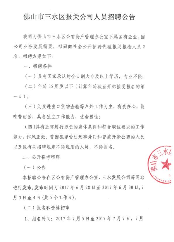 佛山市三水区报关公司人员招聘公告