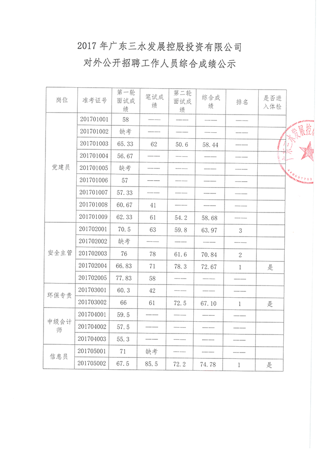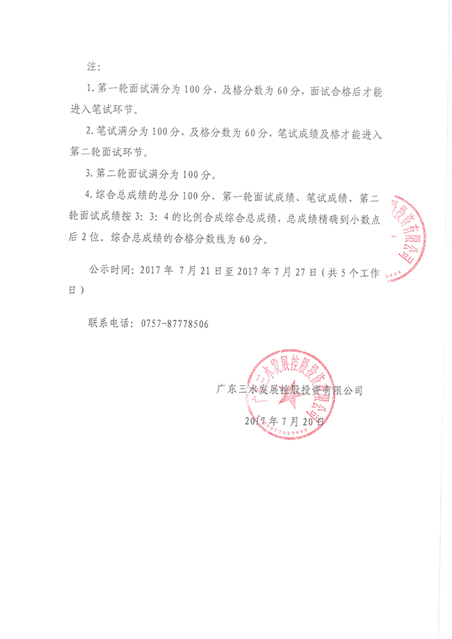 2017年广东三水发展控股投资有限公司对外公开招聘工作人员综合成绩公示