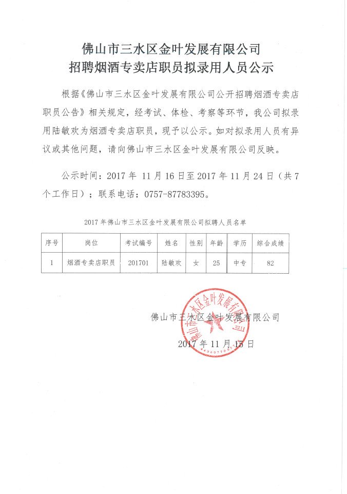 佛山市三水区金叶发展有限公司招聘烟酒专卖店职员拟录用人员公示