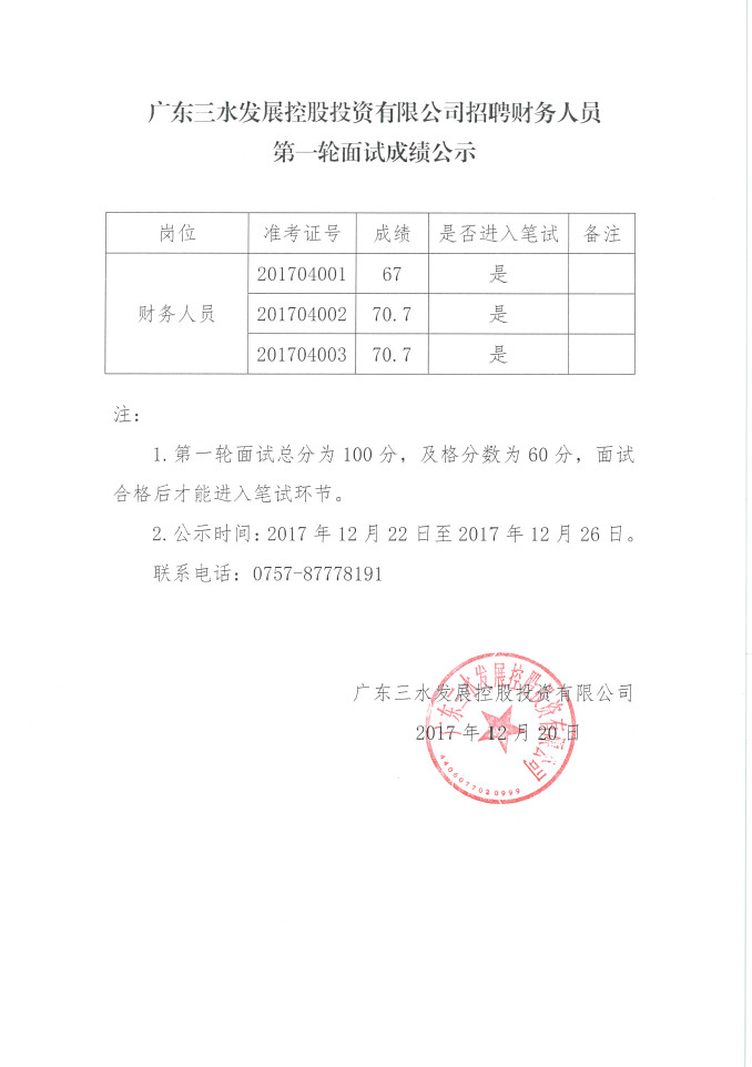 广东三水发展控股投资有限公司招聘财务人员第一轮面试成绩公示