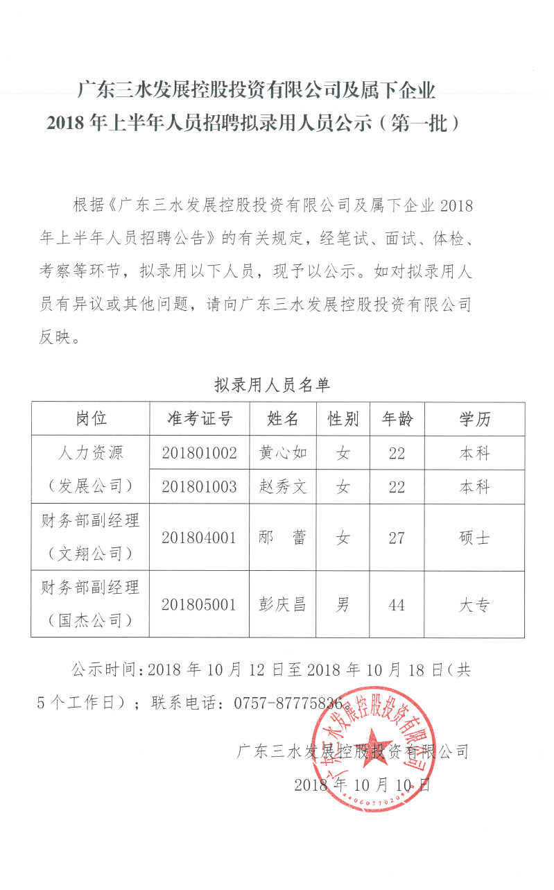 广东三水发展控股投资有限公司及属下企业2018年上半年人员招聘拟录用人员公示(第一批)