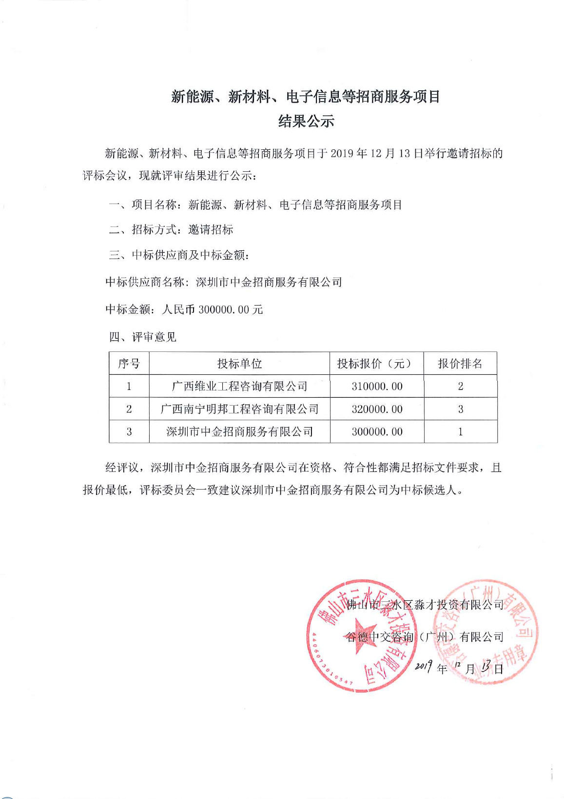 新能源、新材料、电子信息等招商服务项目结果公示