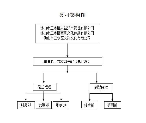 宏益公司、西影公司和文翔公司等3家企业实施“一套人马、三个牌子”管理模式进行经营管理。公司设执行董事、监事、经营班子层,经理层成员3人,设总经理1人,副总经理2人;公司内设五个部门:综合部、财务部、发展部、影剧部、项目部。