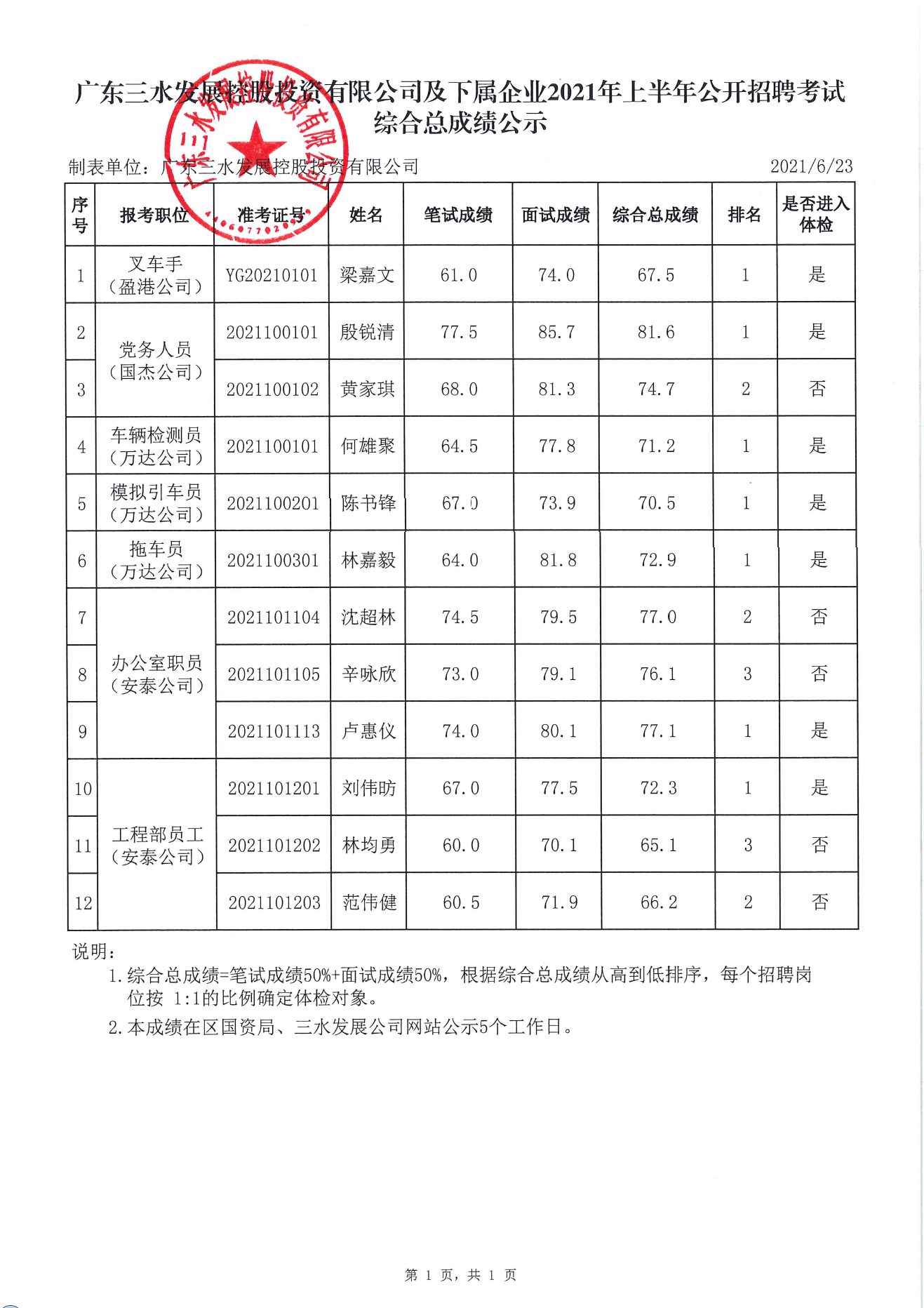 广东三水发展控股投资有限公司及下属企业2021年上半年公开招聘考试综合总成绩公示