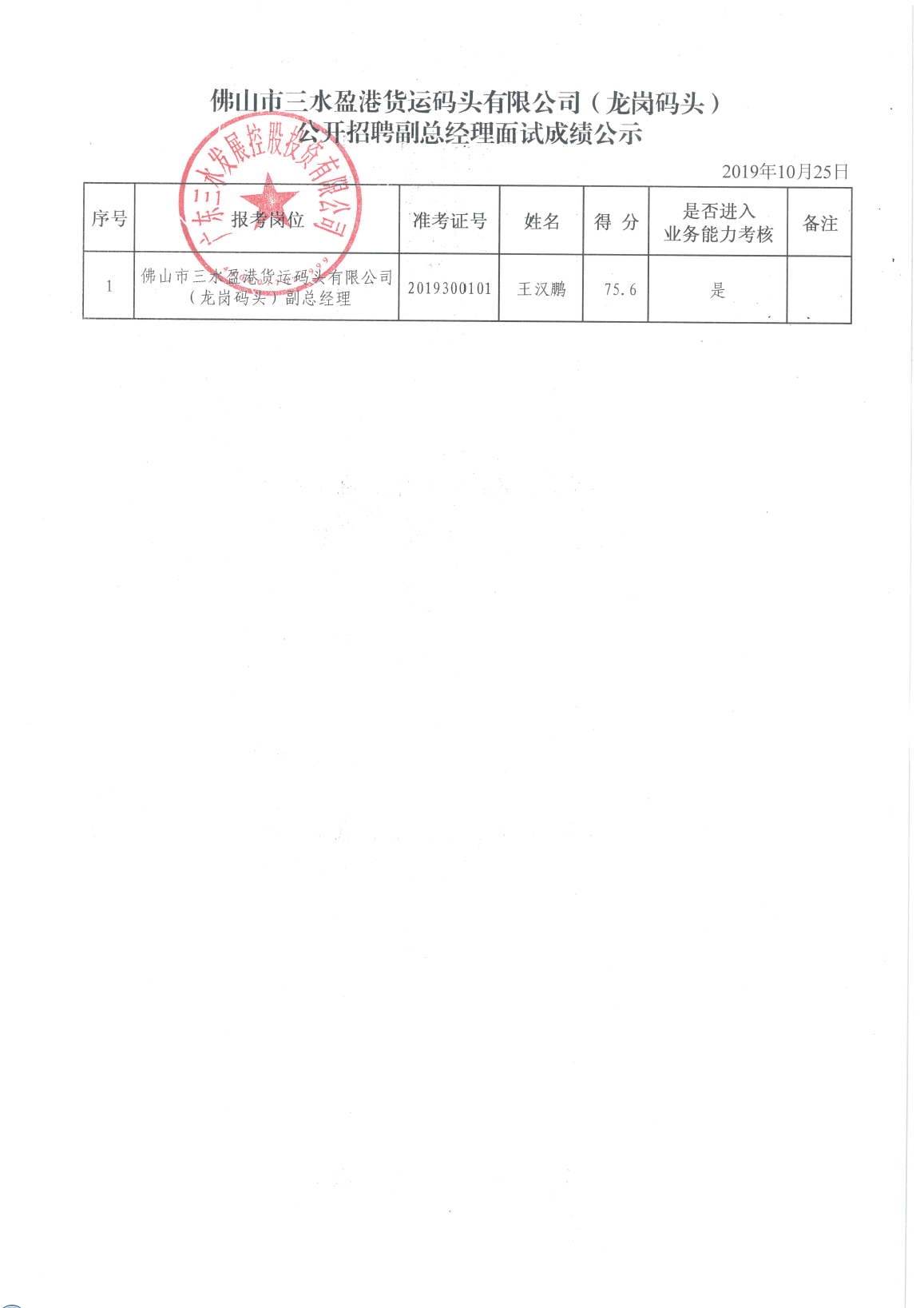 佛山市三水盈港货运码头有限公司(龙岗码头)公开招聘副总经理面试成绩公示