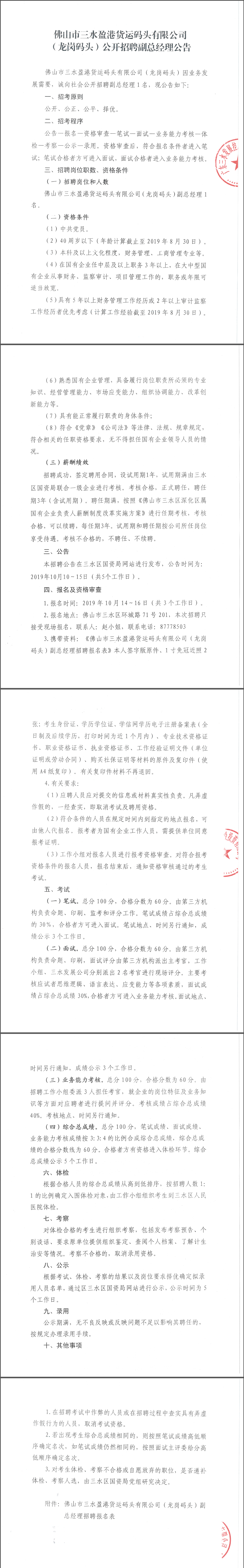 佛山市三水盈港货运码头有限公司(龙岗码头)公开招聘副总经理公告