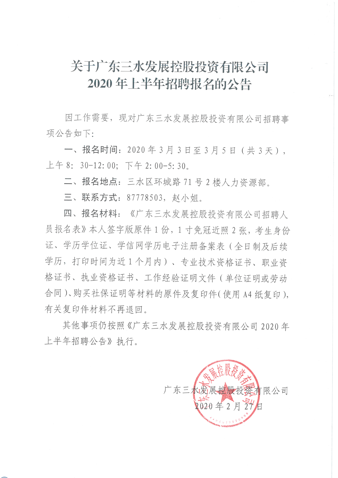关于广东三水发展控股投资有限公司2020年上半年招聘报名的公告