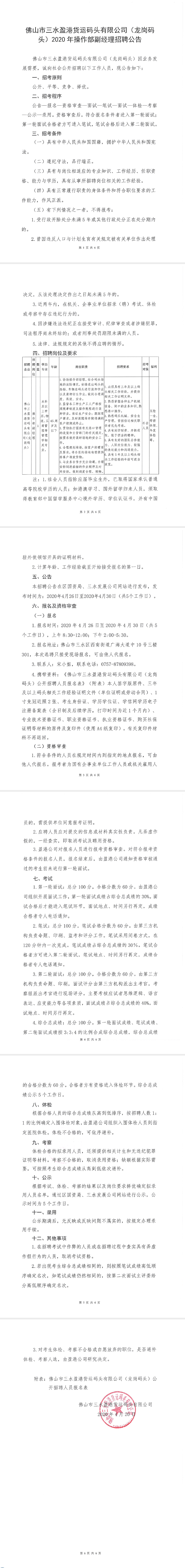佛山市三水盈港货运码头有限公司(龙岗码头)2020年操作部副经理招聘公告
