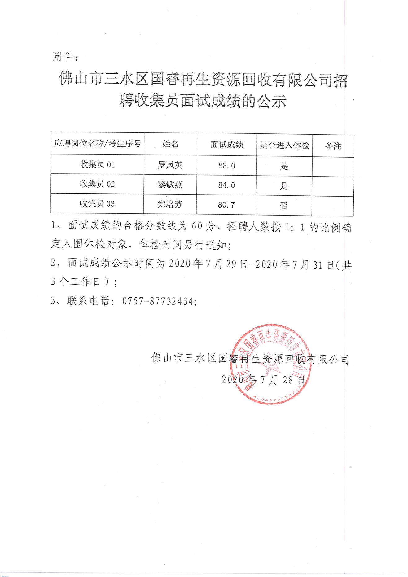 佛山市三水区国睿再生资源回收有限公司招聘收集员面试成绩的公示