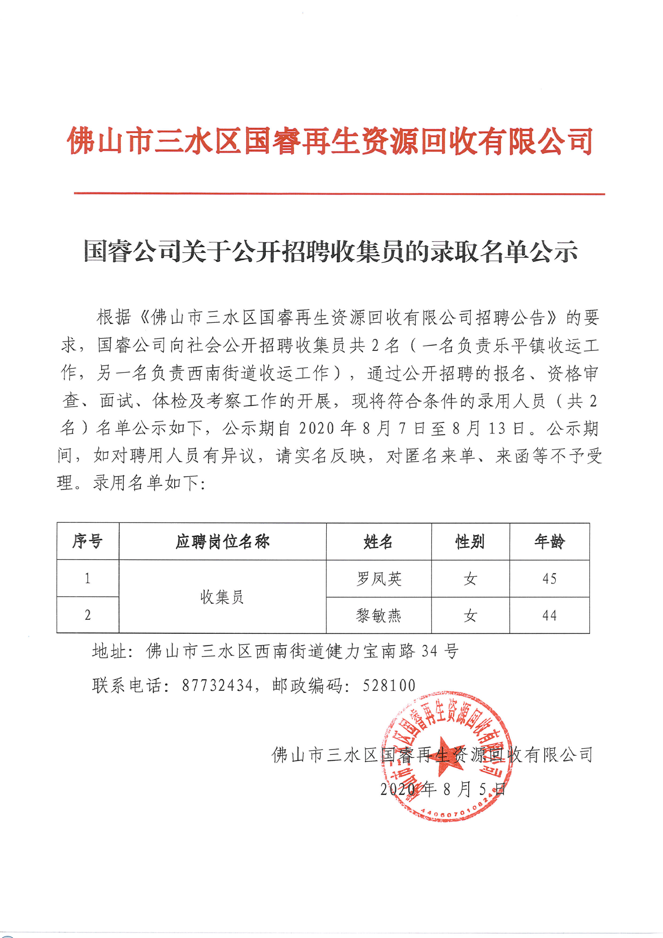 国睿公司关于公开招聘收集员的录取名单公示