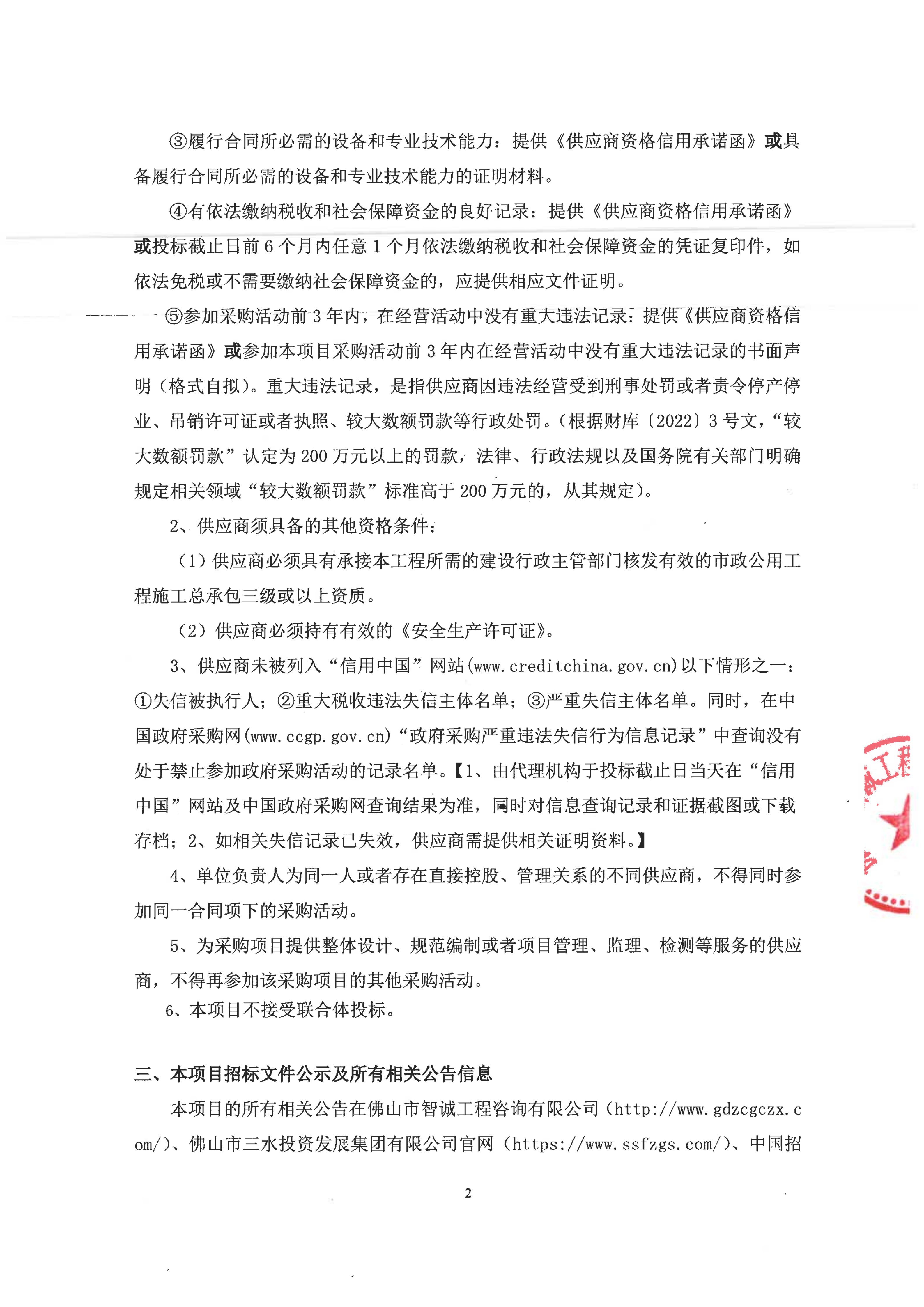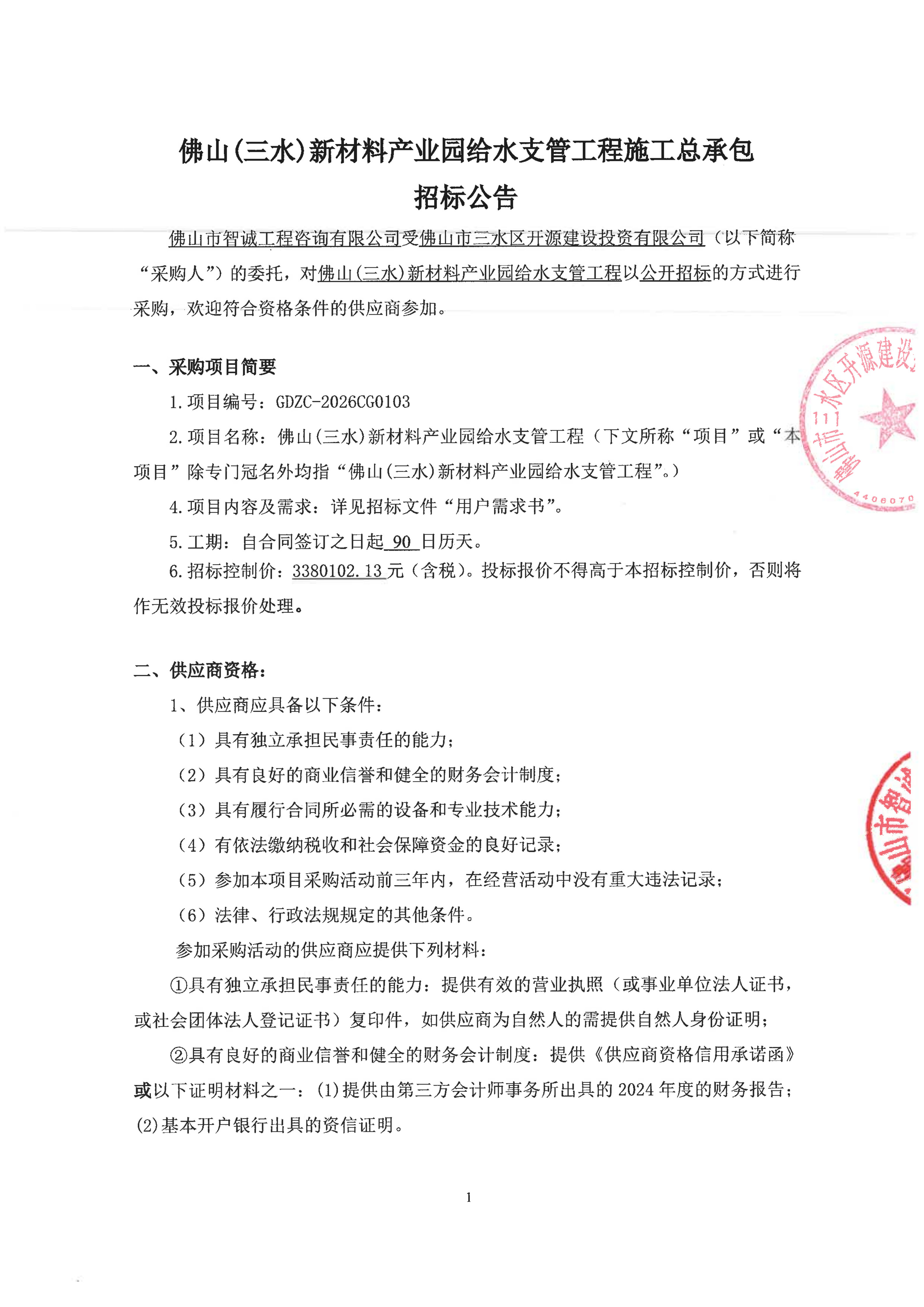 佛山(三水)新材料产业园给水支管工程施工总承包招标公告