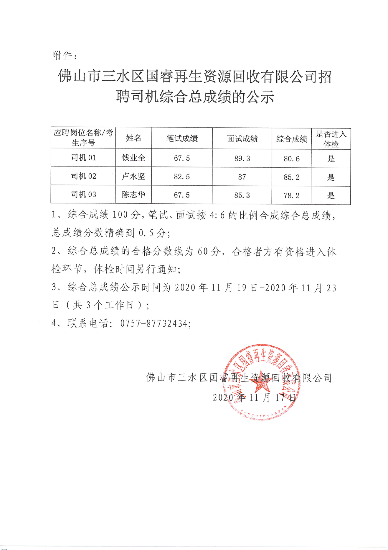 佛山市三水区国睿再生资源回收有限公司招聘司机综合总成绩的公示