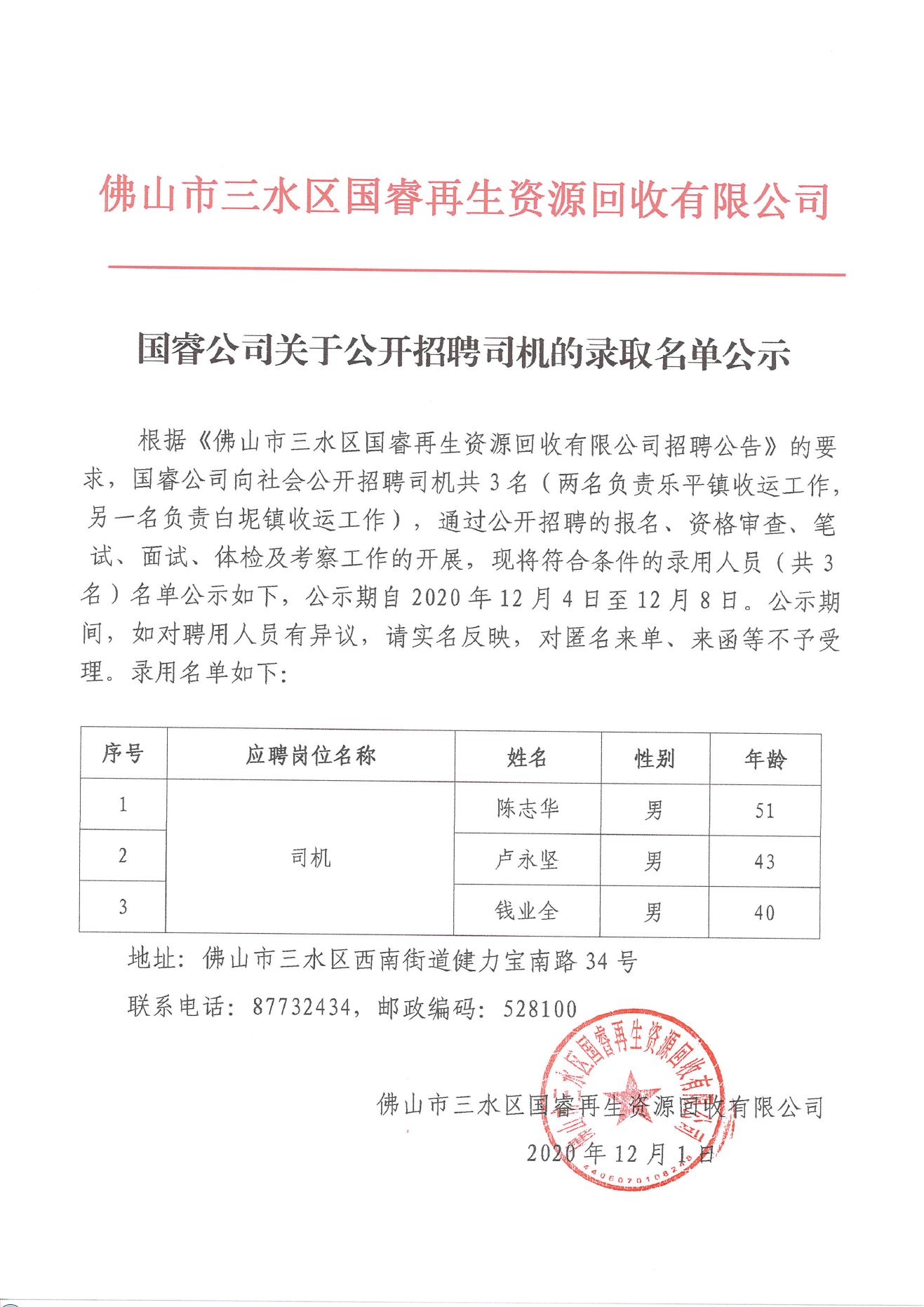 国睿公司关于公开招聘3名司机的录取名单公示