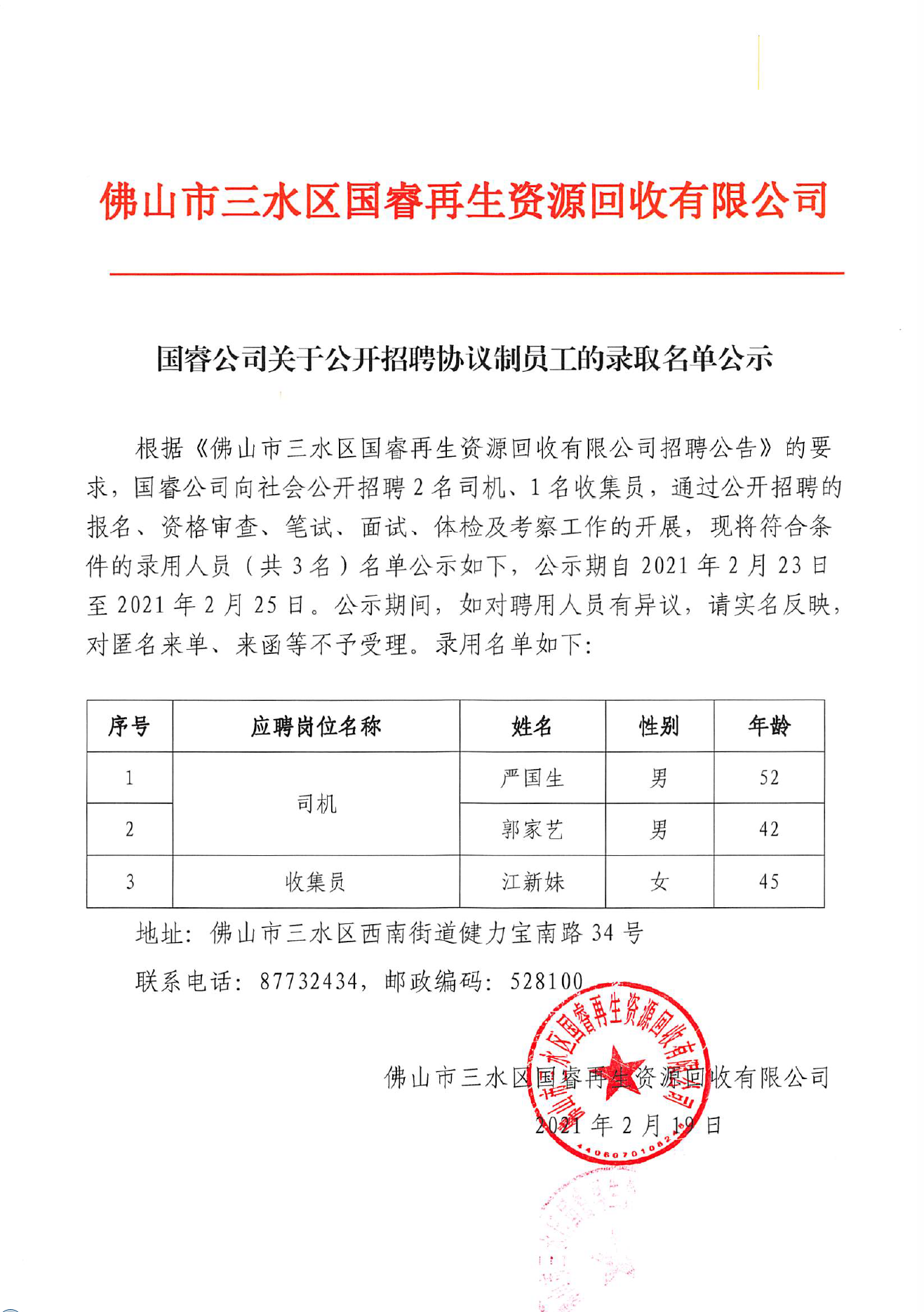 国睿公司关于公开招聘协议制员工的录取名单公示