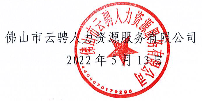 报名时间为2022年5月13日至2022年5月19日,有意者请将报名资料的扫描件发送到佛山市云骋人力资源服务有限公司,邮箱:37785845@qq.com。联系人:伍欢,联系电话:18613178722。逾期或资料不全的,不接受报名。