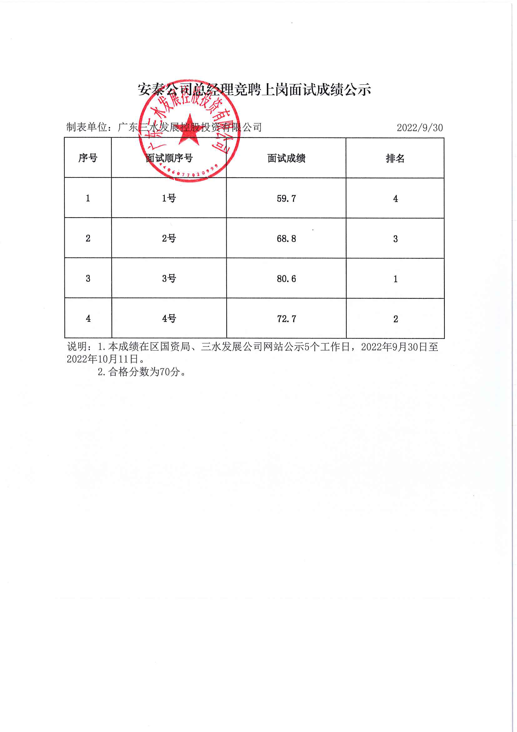 安泰公司总经理竞聘上岗面试成绩公示