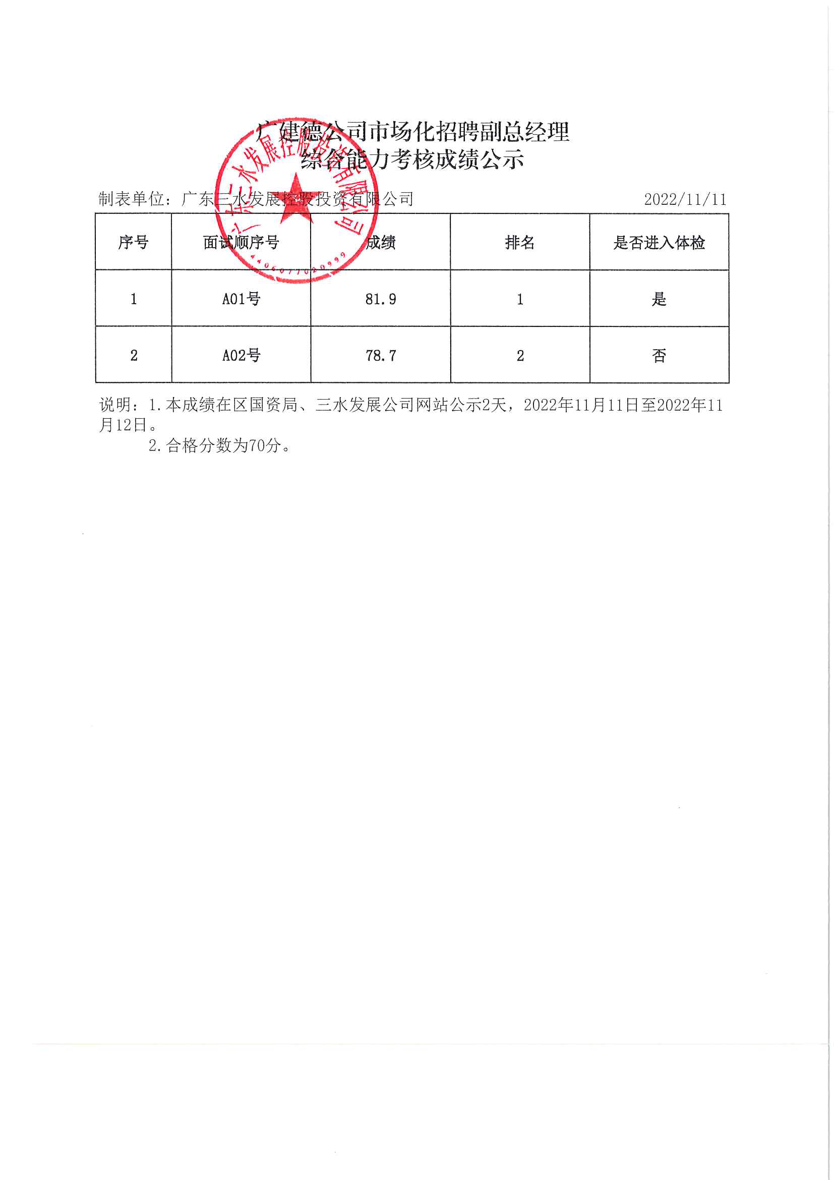 广建德公司市场化招聘副总经理综合能力考核成绩公示