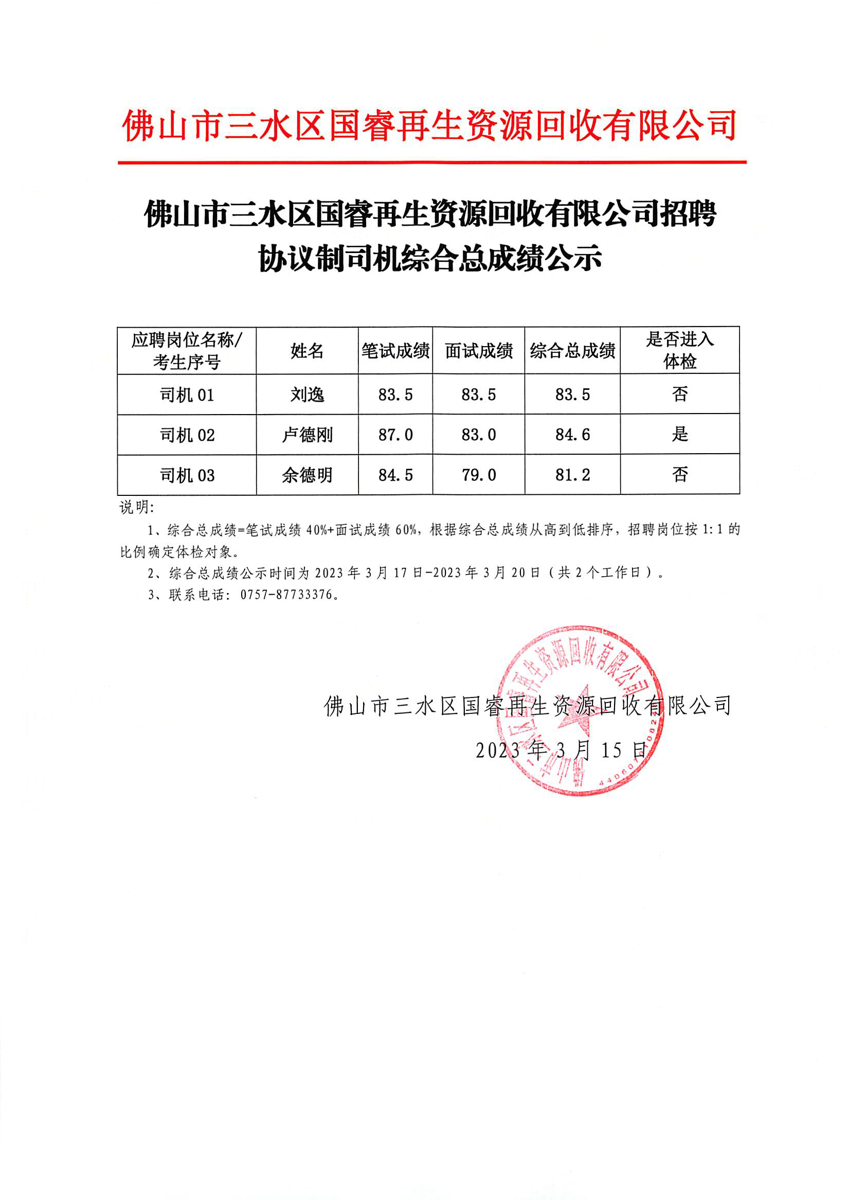 佛山市三水区国睿再生资源回收有限公司招聘协议制司机综合总成绩公示