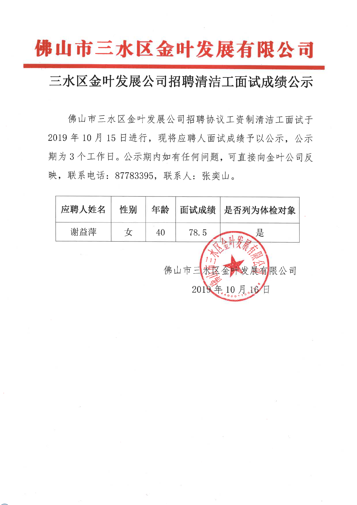 三水区金叶发展公司招聘清洁工面试成绩公示