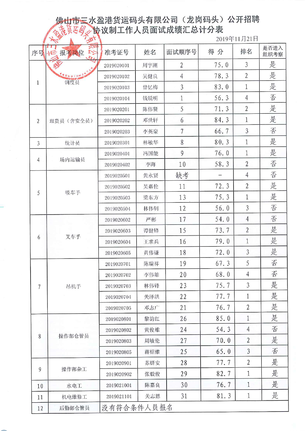 佛山市三水盈港货运码头有限公司(龙岗码头)公开招聘协议制工作人员面试成绩汇总计分表