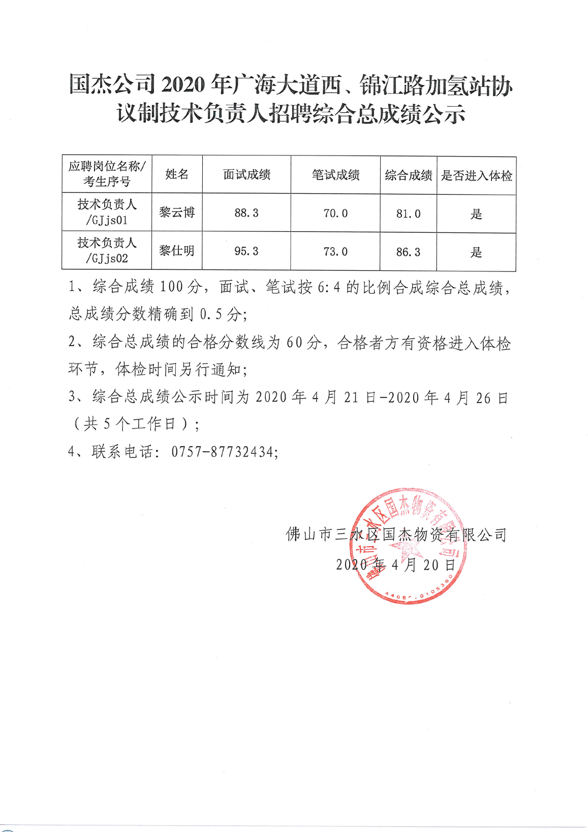 国杰公司2020年广海大道西、锦江路加氢站协议制技术负责人招聘综合总成绩公示