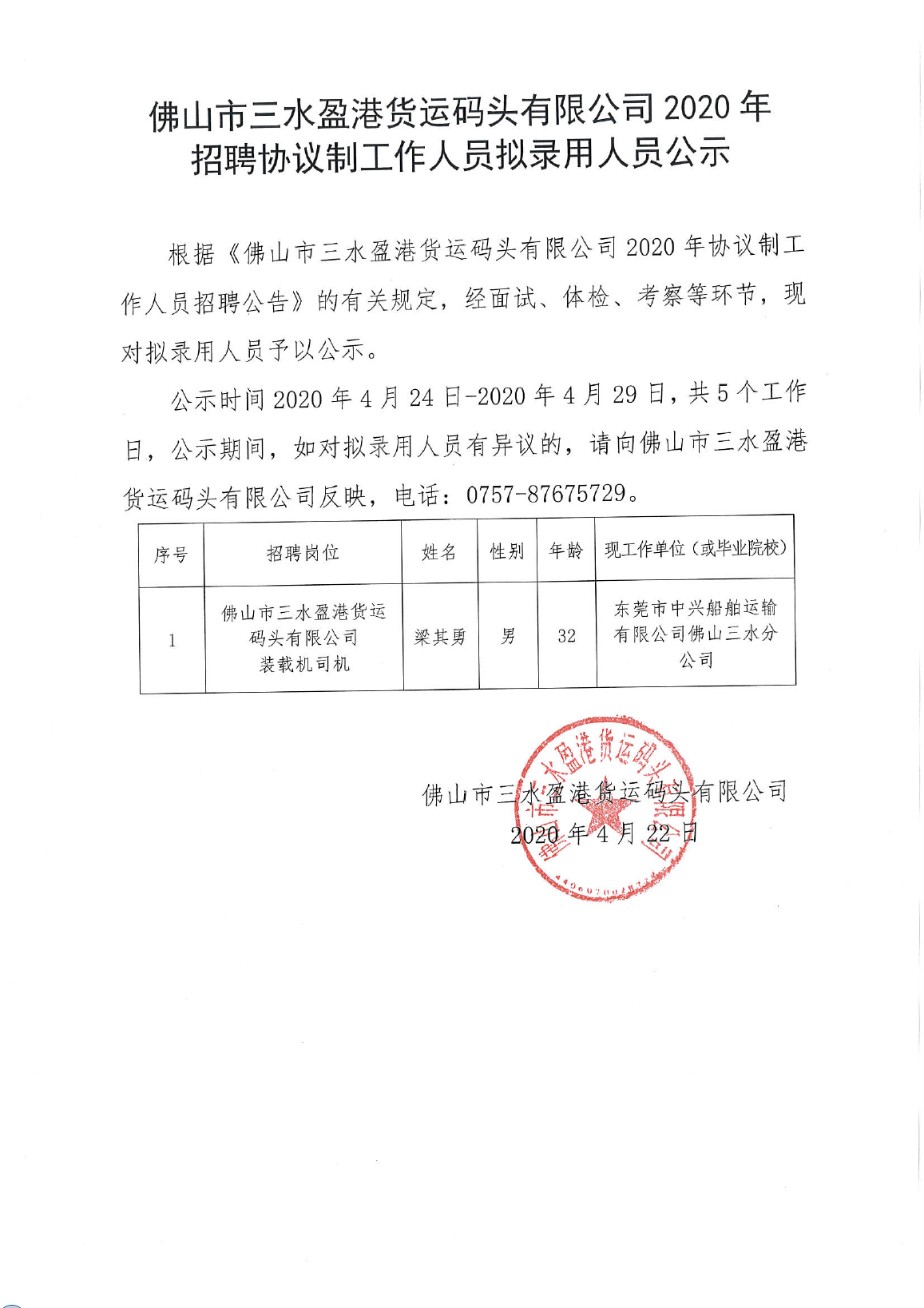 佛山市三水盈港货运码头有限公司2020年招聘协议制工作人员拟录用人员公示
