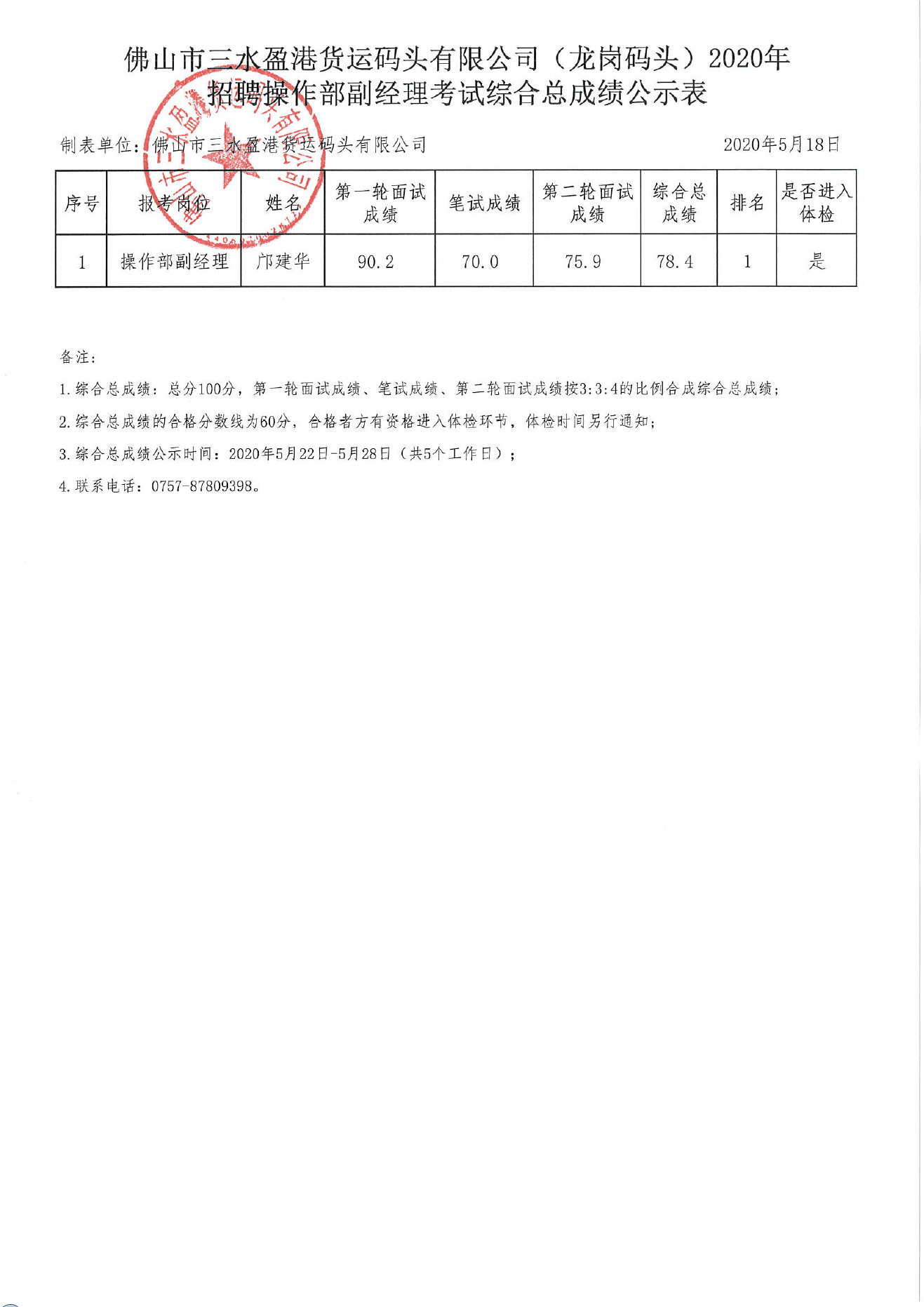 佛山市三水盈港货运码头有限公司(龙岗码头)2020年招聘操作部副经理考试综合总成绩公示表