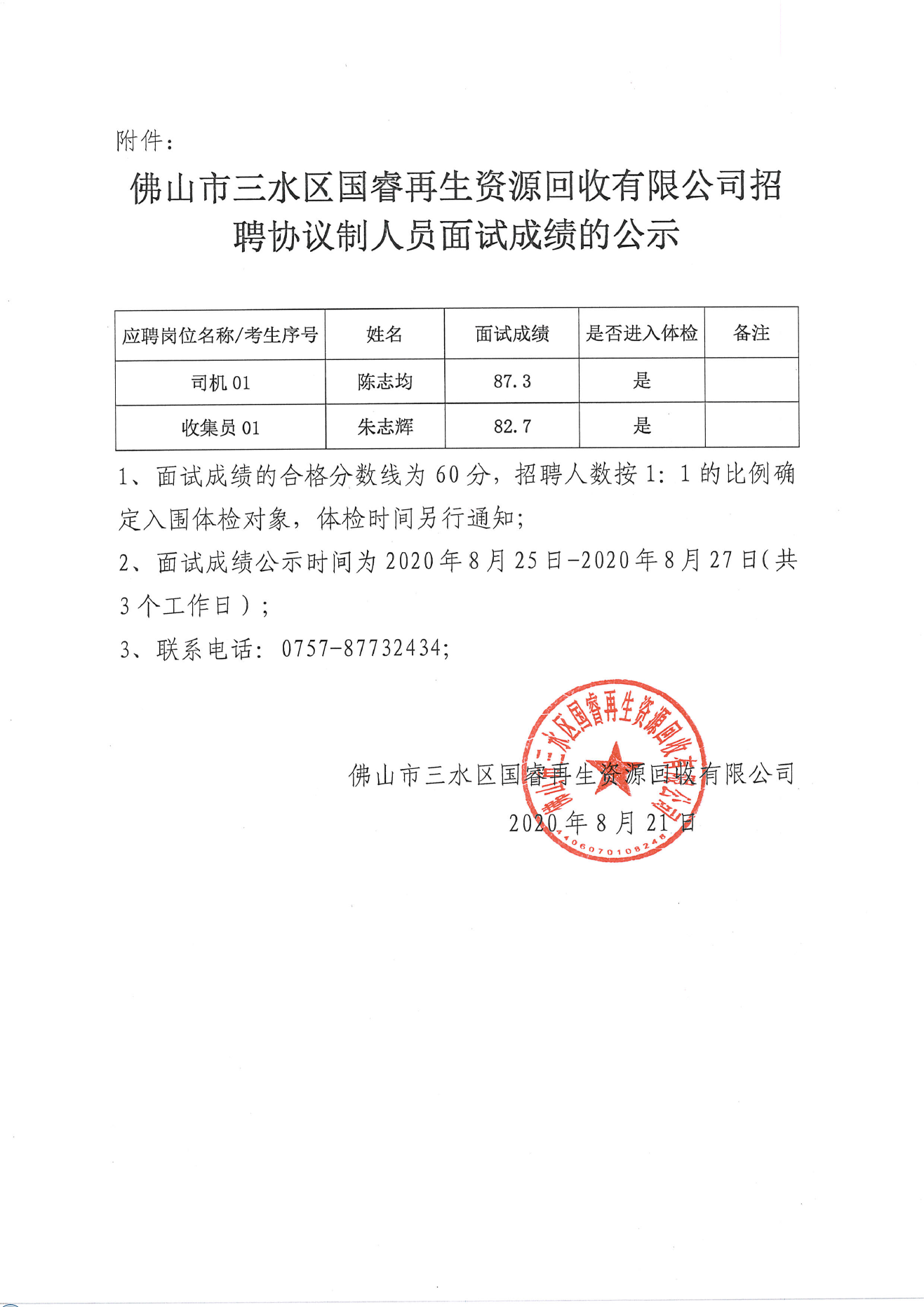 佛山市三水区国睿再生资源回收有限公司招聘协议制人员面试成绩的公示